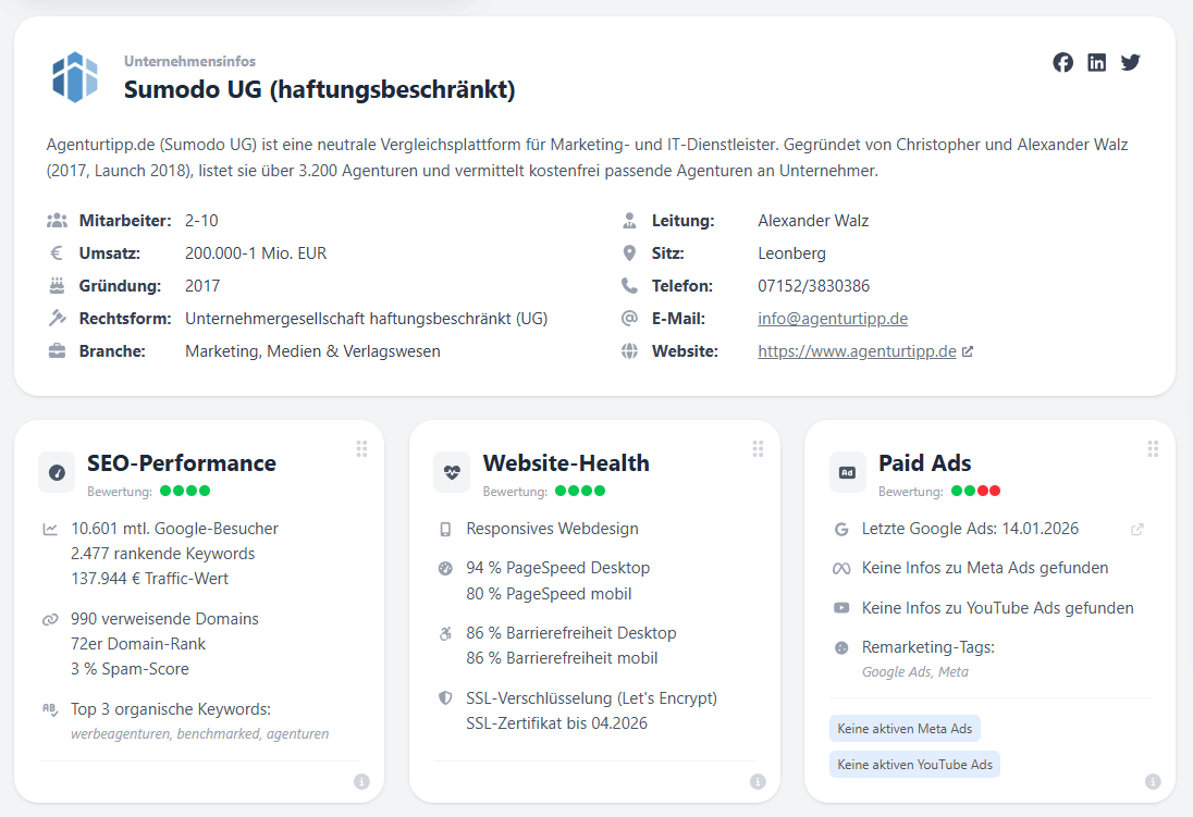 Erfahre in nur 10 Sekunden alles über einen Lead, bevor du deinen Hörer in die Hand nimmst: Ob SEO-Performance, Website-Health, Social Media Aktivitäten oder aktive Paid-Kampagnen - mit Leadreader sparst du dir nicht nur viel Recherche-Arbeit, du wirst auch während des Vertriebscalls über unseren KI-Sales-Coach mit den passenden Argumenten versorgt. Starte jetzt deine erste Analyse!